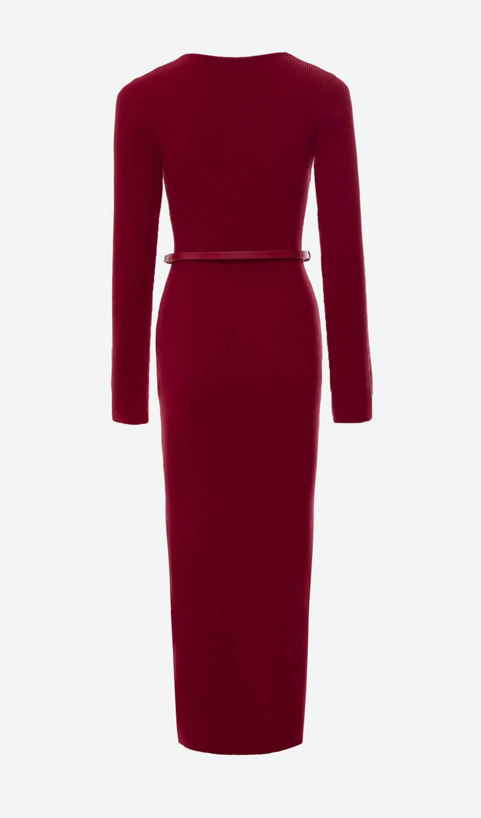 Örme V Yaka Kemerli Midi Elbise -Kırmızı