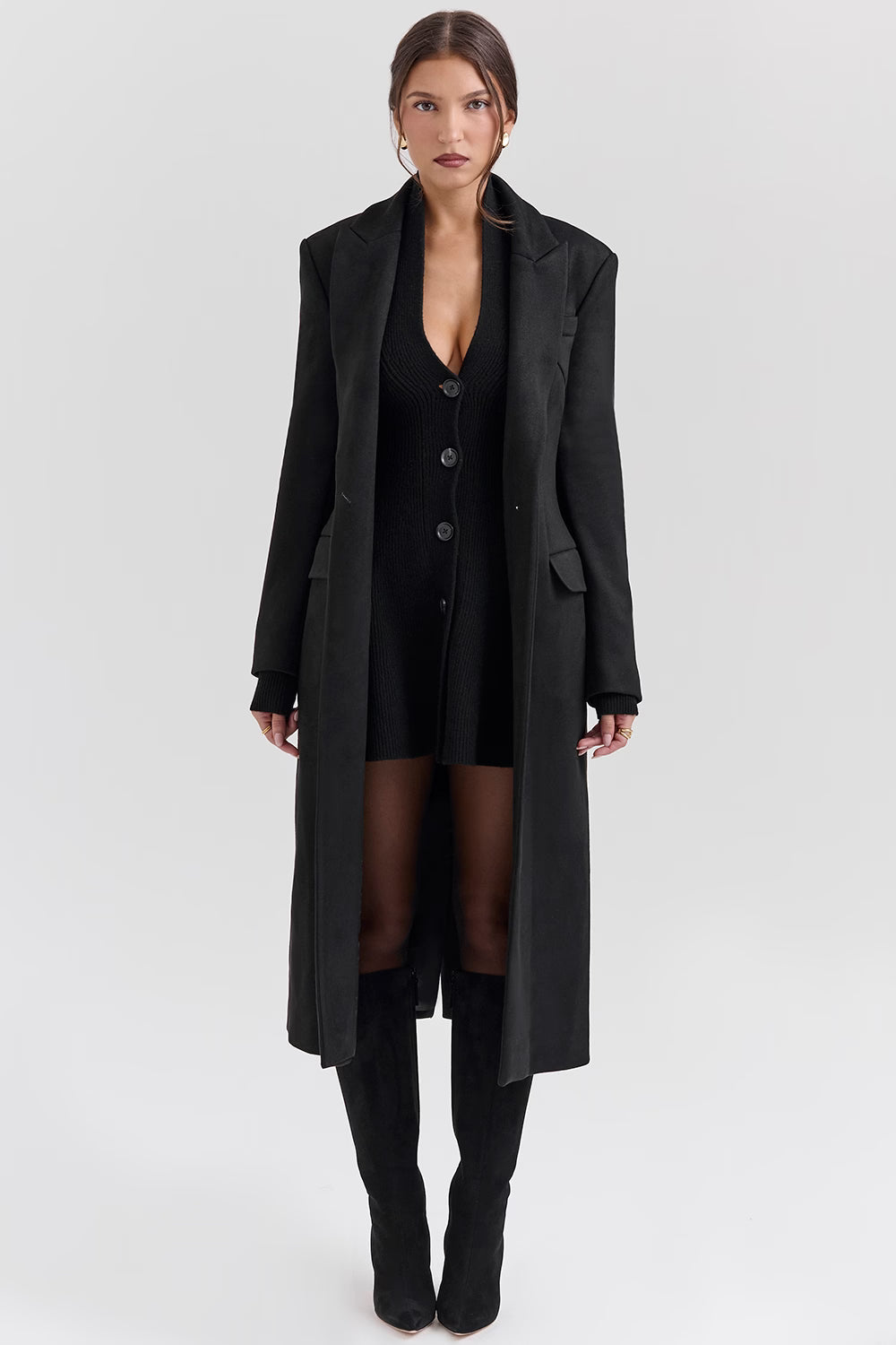 Bu uzun siyah kaban, zamansız şıklığı ve güçlü duruşu bir araya getiriyor. Minimal tasarımı ve tek düğmeli kapanışıyla sofistike bir görünüm sunarken, uzun boyu sayesinde hem şehir şıklığında hem de özel davetlerde kusursuz bir tercih oluşturur.