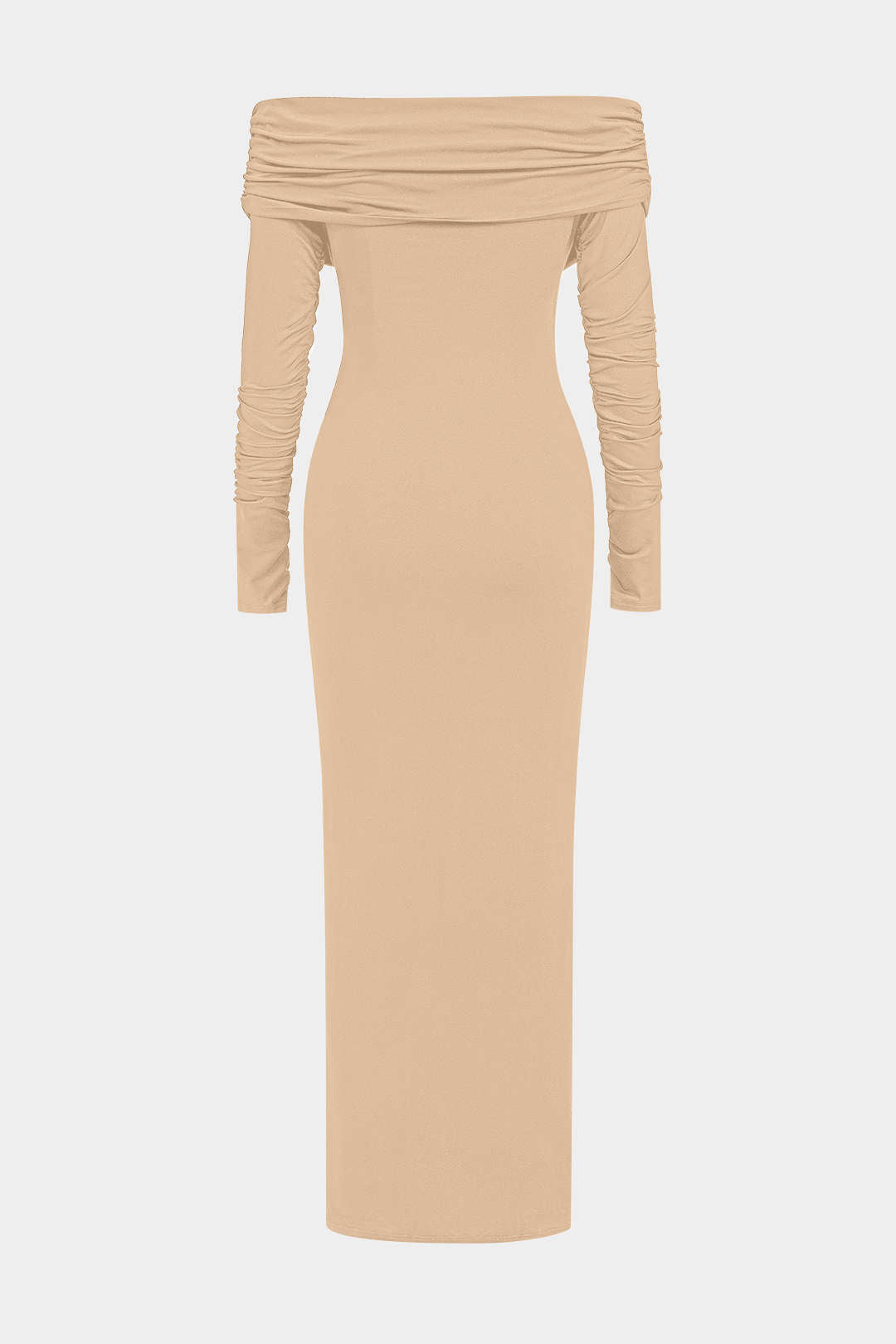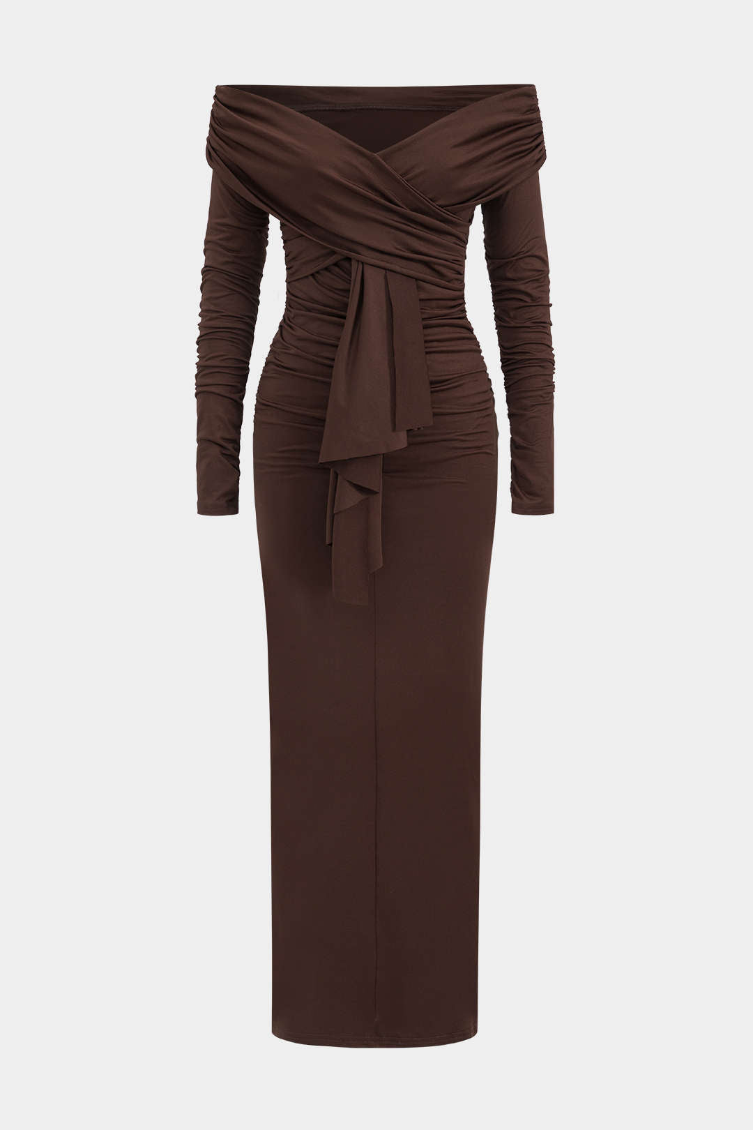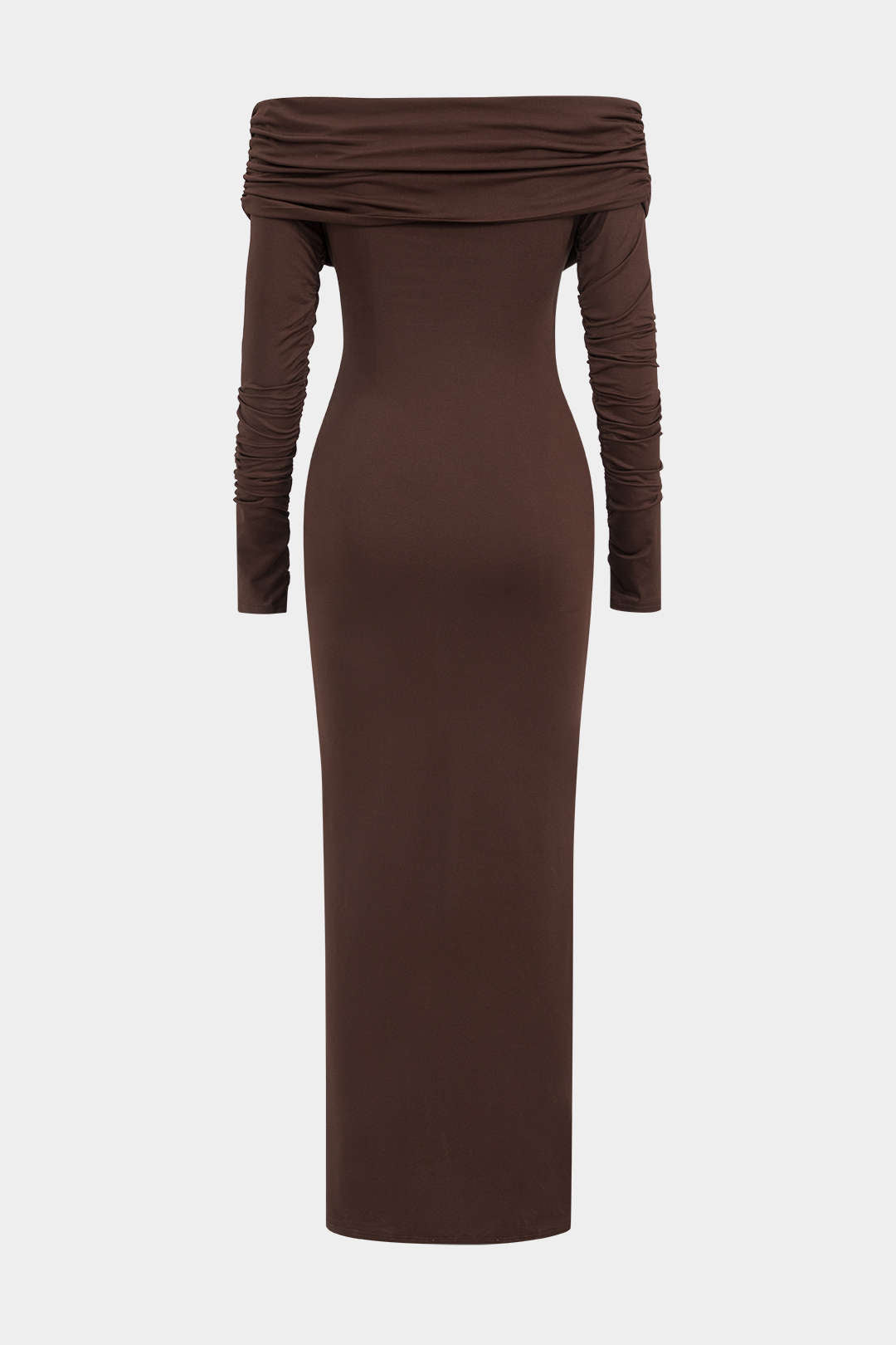 Feminen şıklığın en sofistike hali: düşük omuz kahverengi drapeli maxi elbise. Göğüs dekoltesini zarifçe vurgulayan düşük omuz kesimi ve ön kısımdaki drape detaylarıyla dikkat çeker. Vücudu saran formu ile feminen silueti ortaya çıkarırken, uzun etek boyu ve yumuşak dökümlü kumaşıyla hem şık davetlerde hem de özel gecelerde iddialı bir seçimdir.
