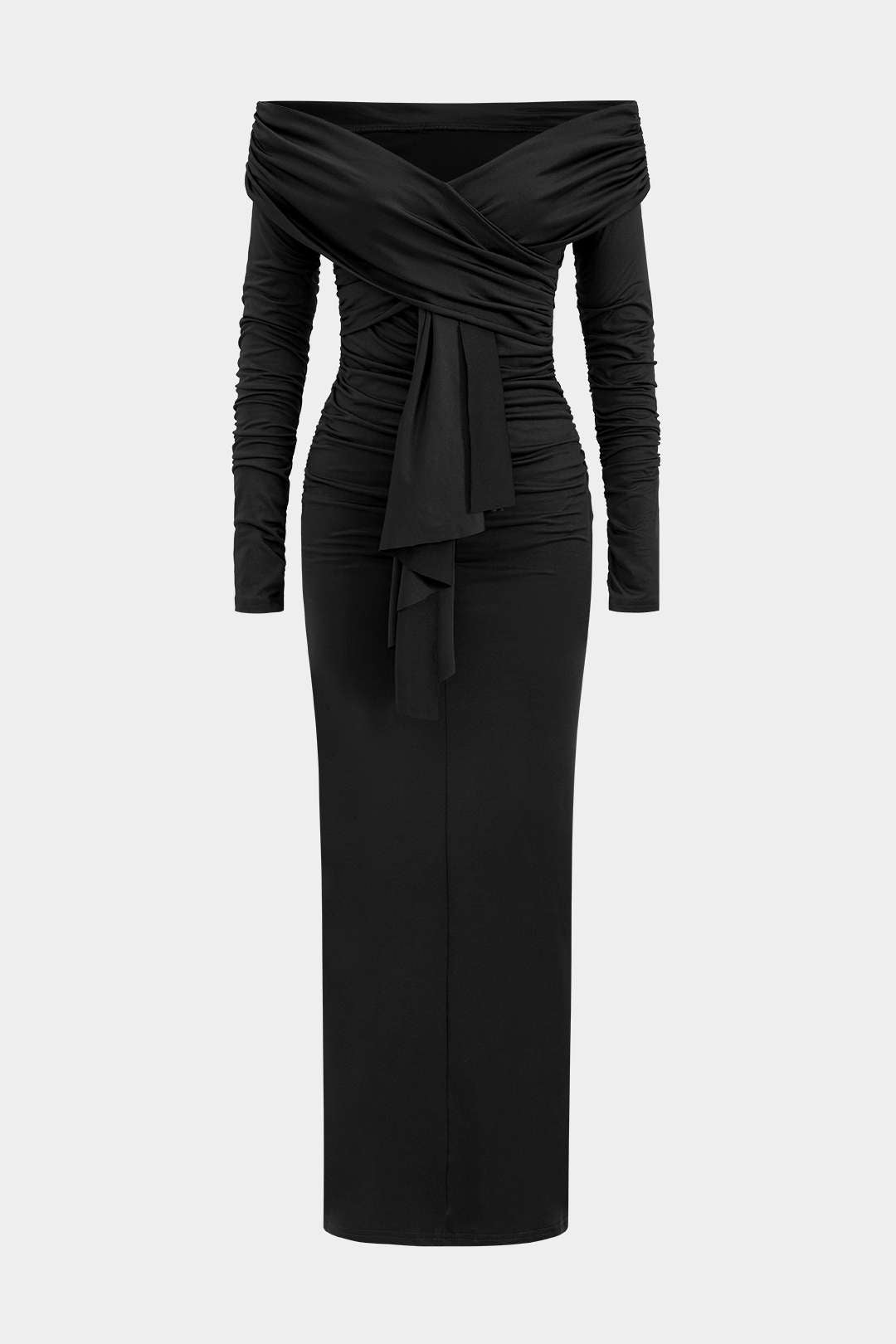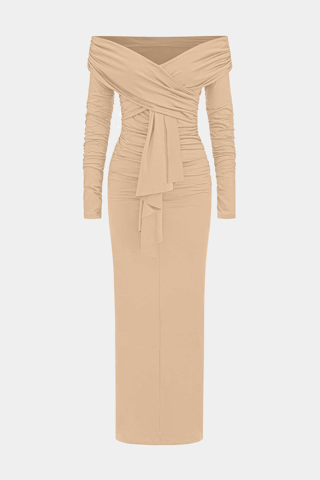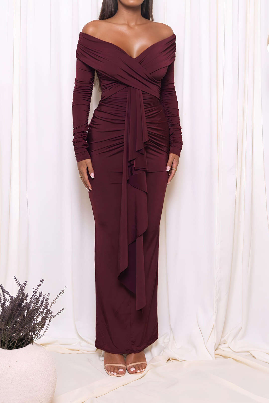 Feminen şıklığın en sofistike hali: düşük omuz kahverengi drapeli maxi elbise. Göğüs dekoltesini zarifçe vurgulayan düşük omuz kesimi ve ön kısımdaki drape detaylarıyla dikkat çeker. Vücudu saran formu ile feminen silueti ortaya çıkarırken, uzun etek boyu ve yumuşak dökümlü kumaşıyla hem şık davetlerde hem de özel gecelerde iddialı bir seçimdir.