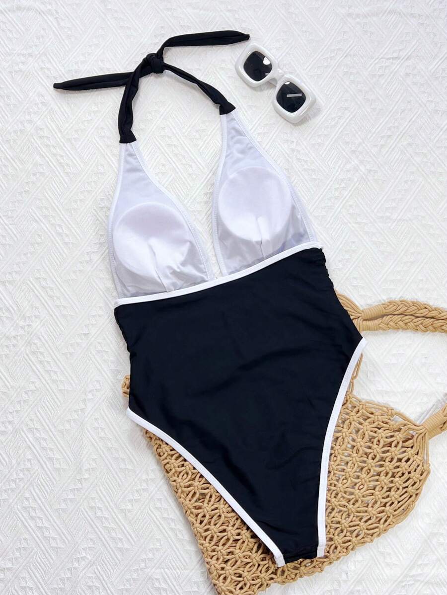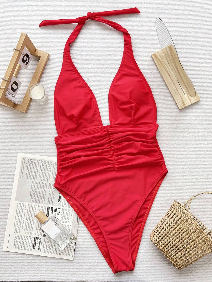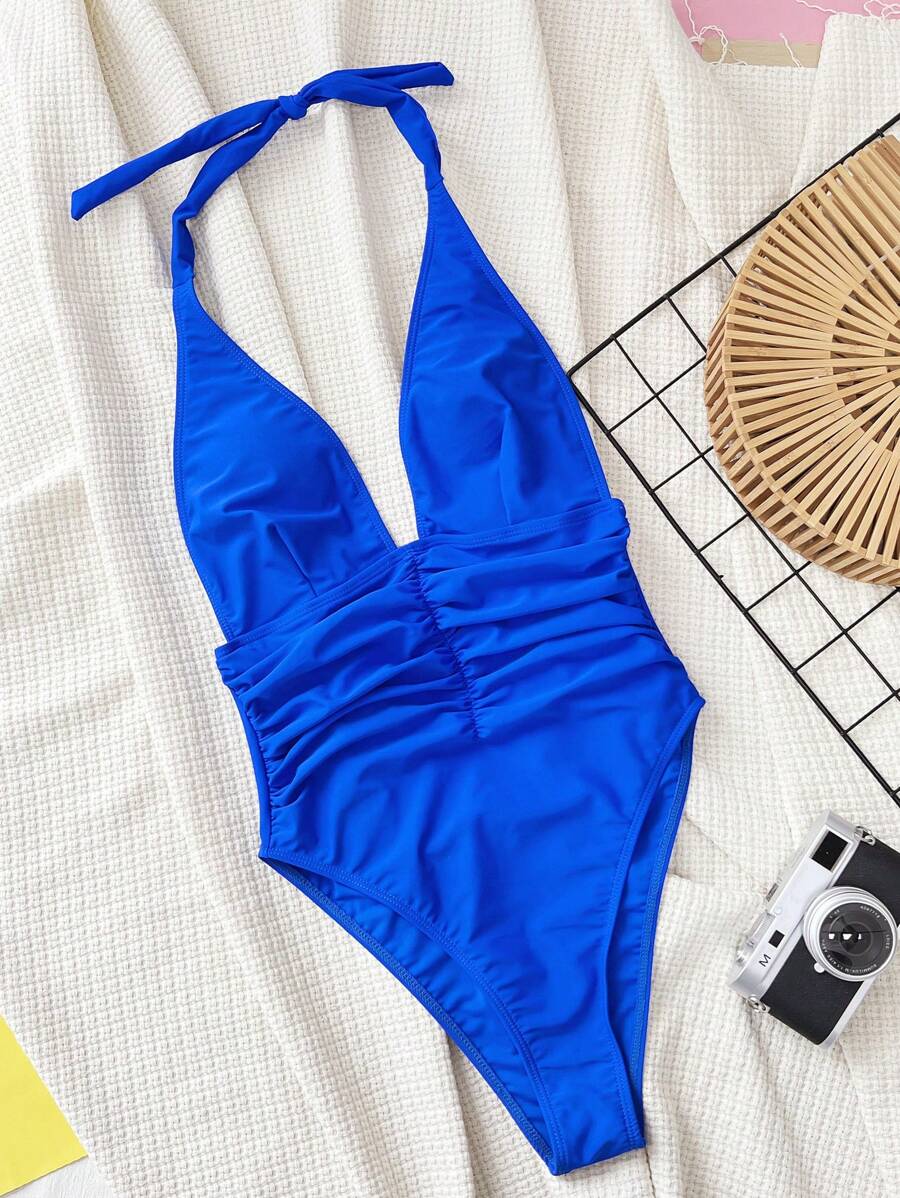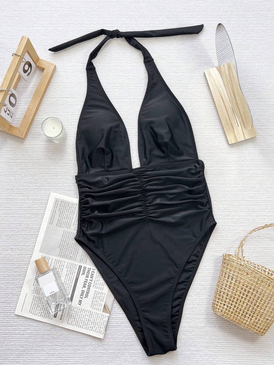 Halter Yaka Sade Tek Parça Mayo