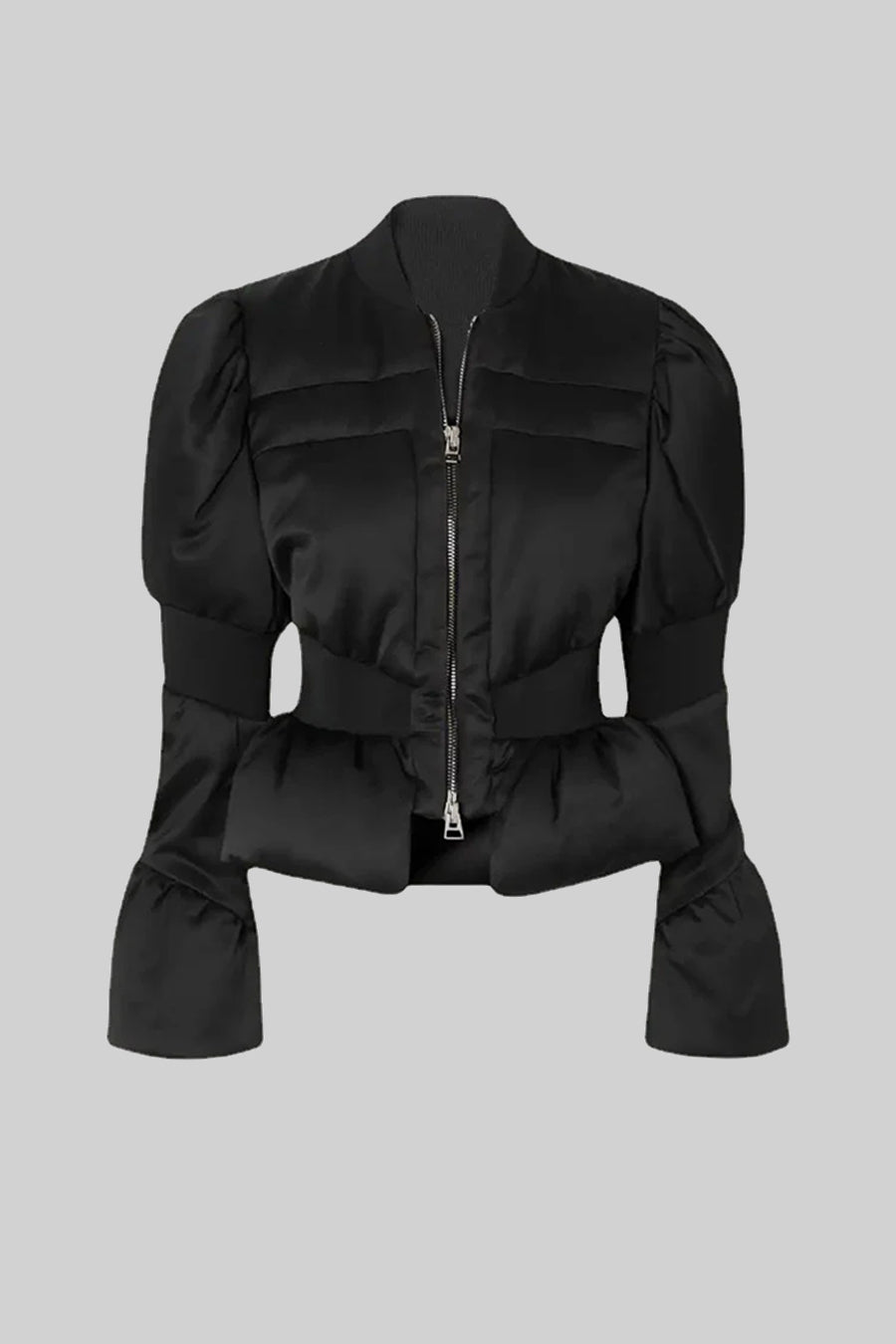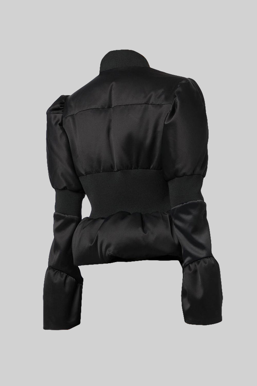 Şık ve modern bir tarz sunan bu siyah kısa şişme ceket, vücuda oturan beli ve puff detaylı kollarıyla öne çıkar. Zarif tasarımı ve siyah rengi, her kombini kolayca tamamlayacak şekilde tasarlanmıştır. Günlük kullanımda hem rahat hem stil sahibi bir seçenek sunar.