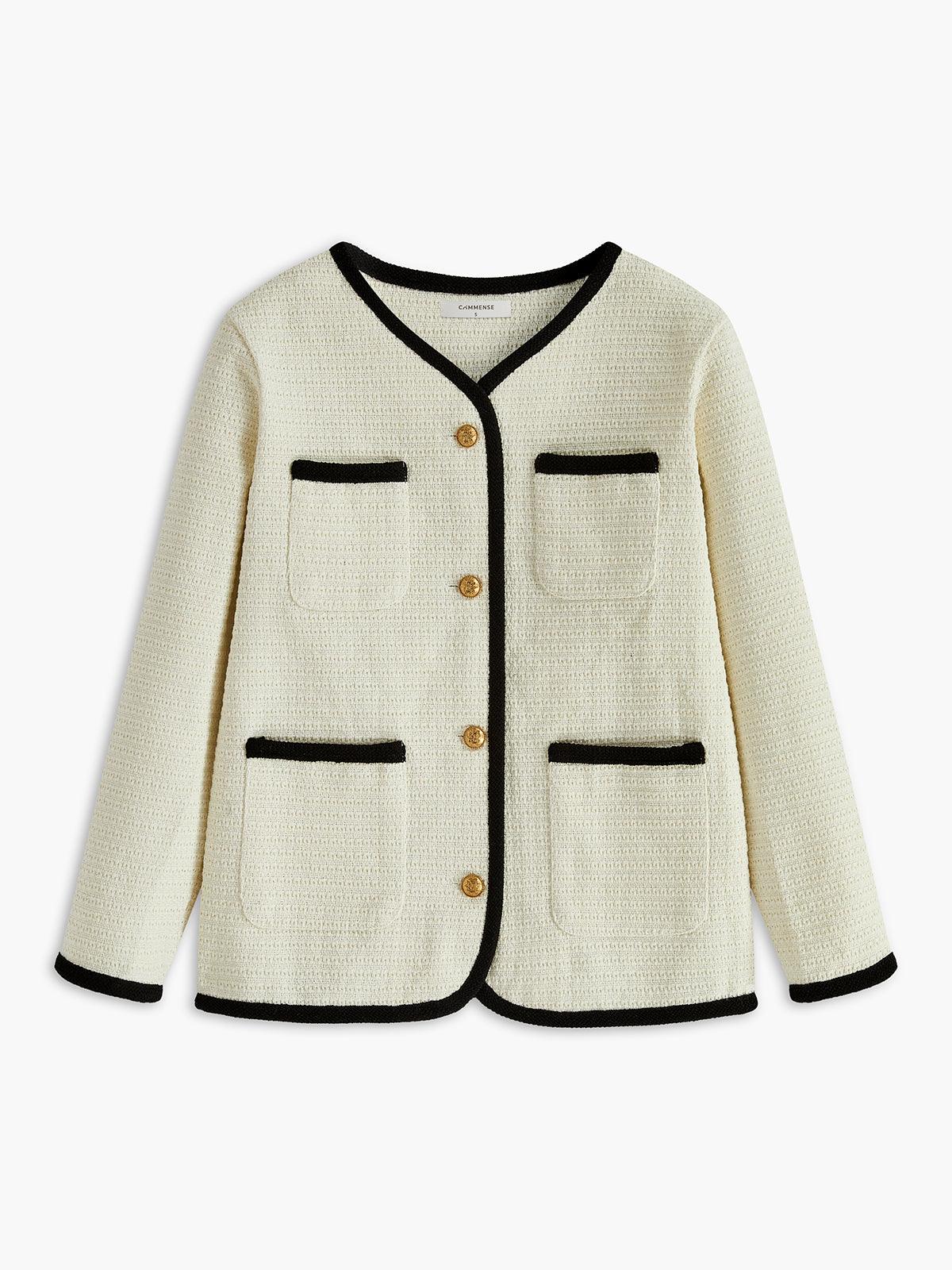 Zarif tasarımı ve siyah şerit detaylarıyla öne çıkan bu beyaz hırka, altın düğmeleri ve dört cebiyle klasik bir stil sunuyor. Hem günlük kullanımda hem de şık kombinlerde tercih edebileceğiniz, sofistike bir parça!