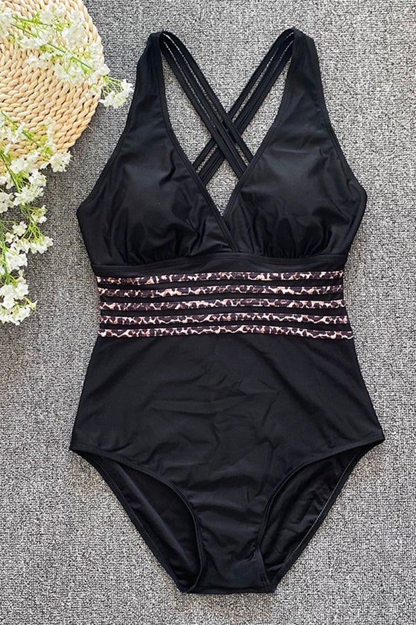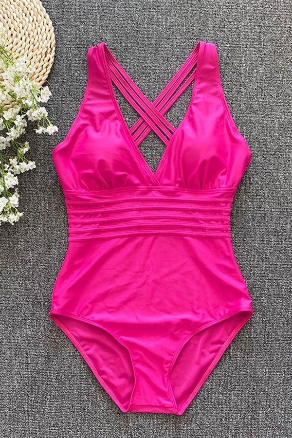Düz Renk Sırtı Açık Üç Boyutlu Çizgili Tek Parça Mayo