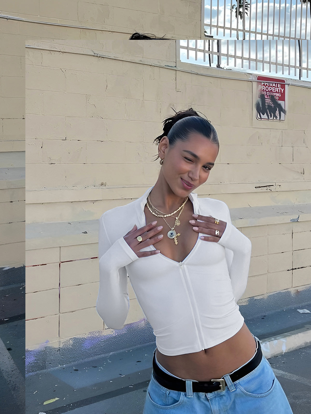 Düz Beden Sıkı Fermuar Detaylı Uzun Kollu Bluz