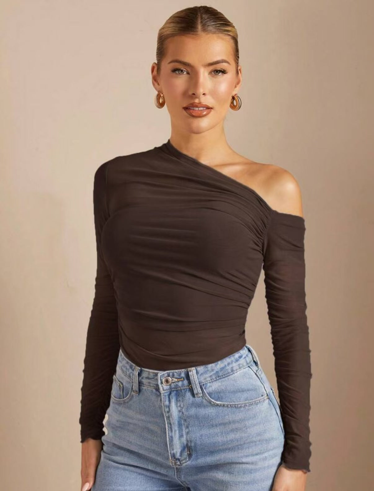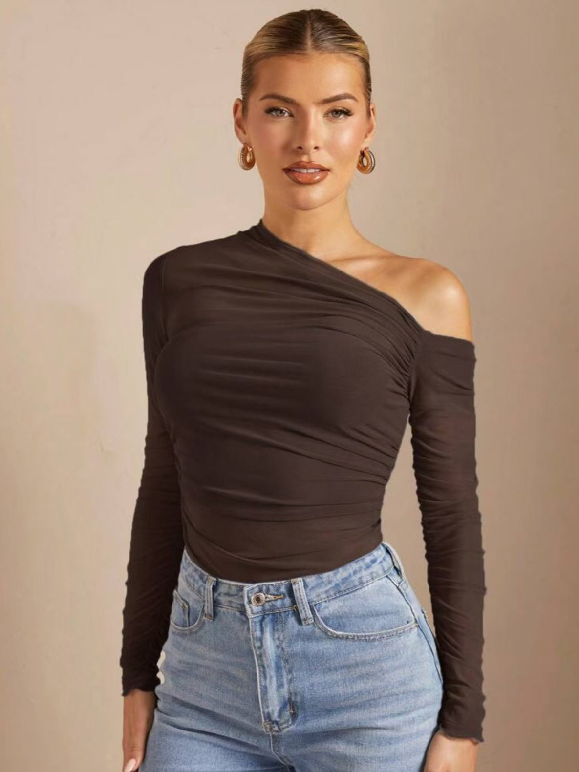 Feminen ve modern tasarımıyla öne çıkan bu tek omuz bluz, drapeli yapısıyla zarif bir görünüm sunar. Hafif esnek kumaşı vücuda oturarak şık bir silüet oluştururken, açık omuz detayı feminen bir hava katar. Akşam davetlerinden günlük şıklığa kadar her kombine uyum sağlar.