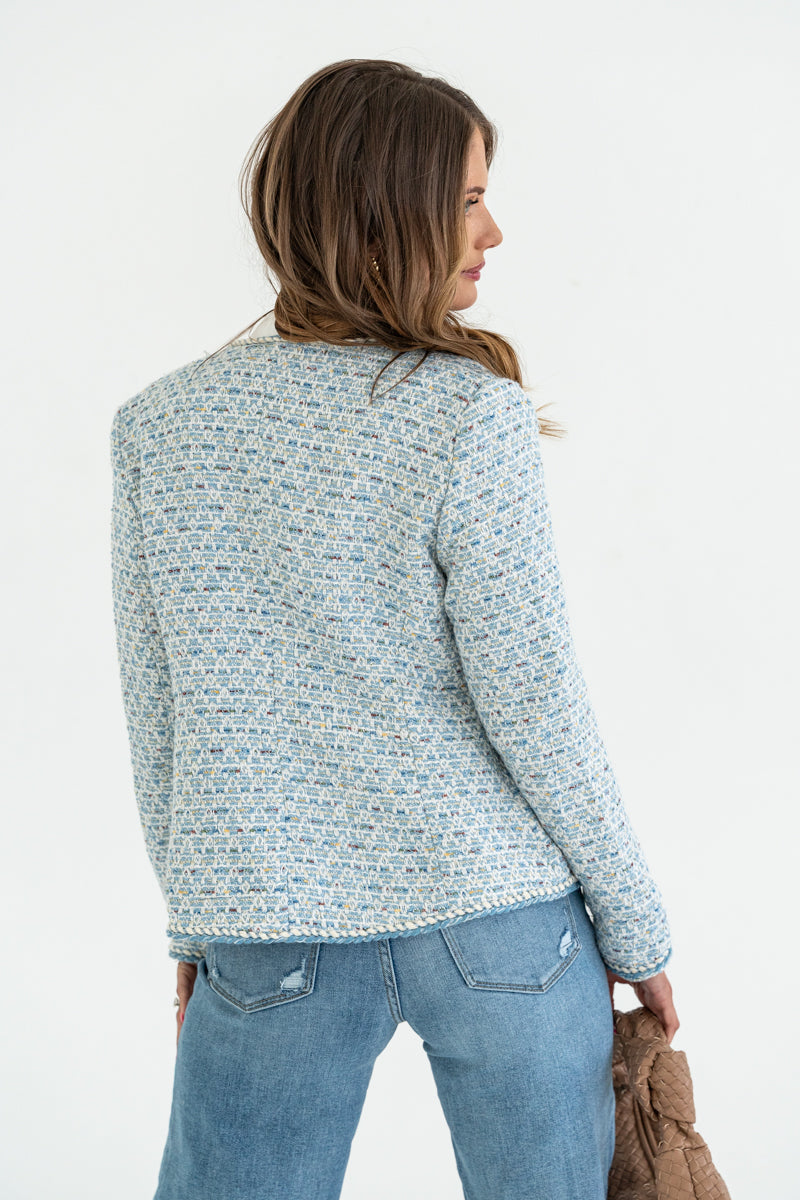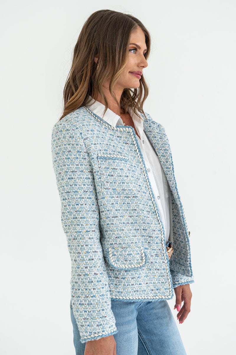 Göz alıcı bir şıklığa hazır ol! Brenna Tweed Ceket, mavi tonlardaki tweed kumaşı, örgü şerit detayları ve düğmeli tasarımıyla sofistike ve eğlenceli bir tarzı bir araya getiriyor. Yüksek bel pantolon ve topuklu ayakkabılarla kombinlediğinde ofis şıklığını zahmetsizce bir üst seviyeye taşıyabilirsin.