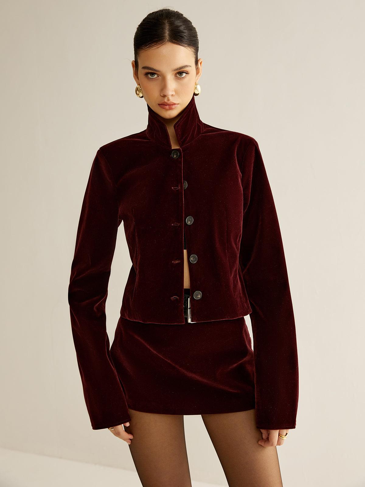 Bordo Kadife Düğme Detaylı Kısa Ceket