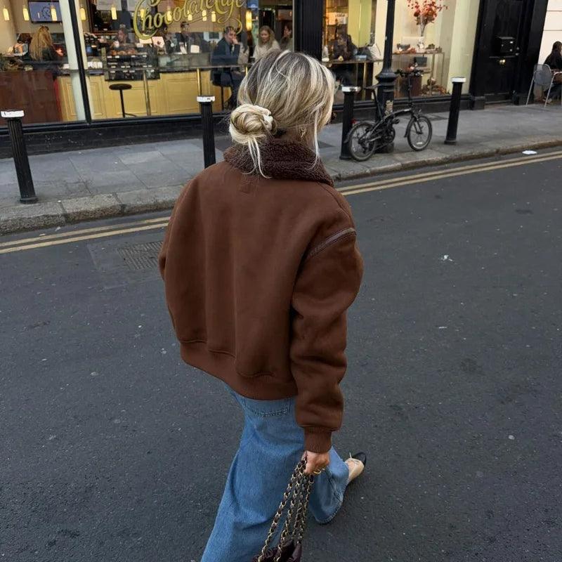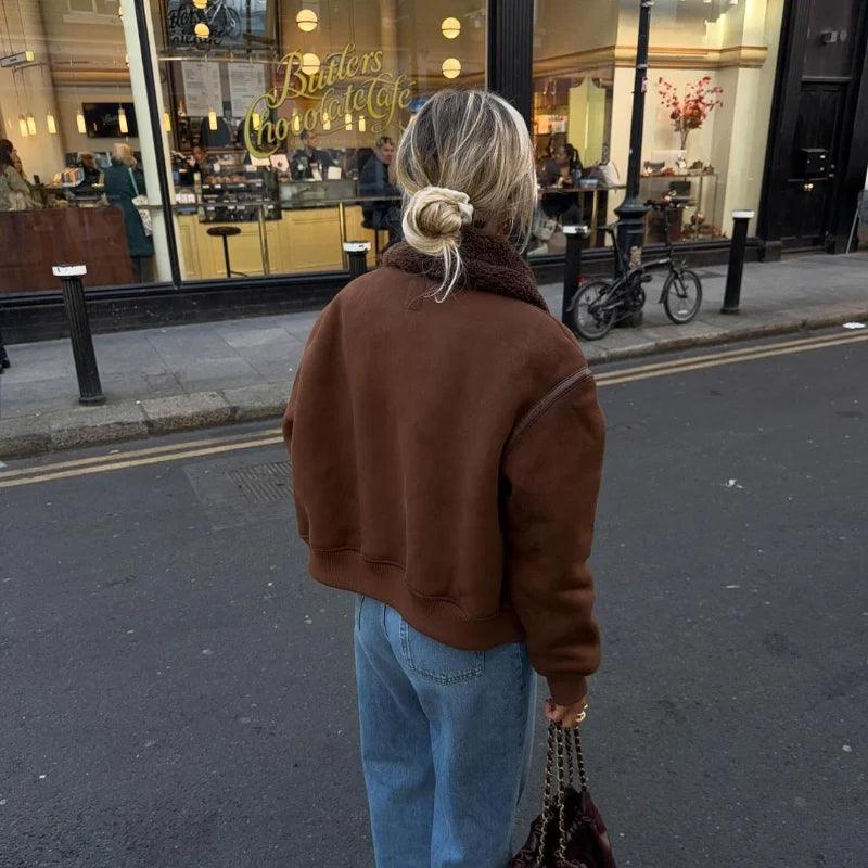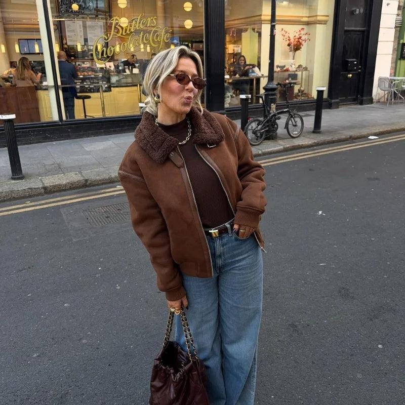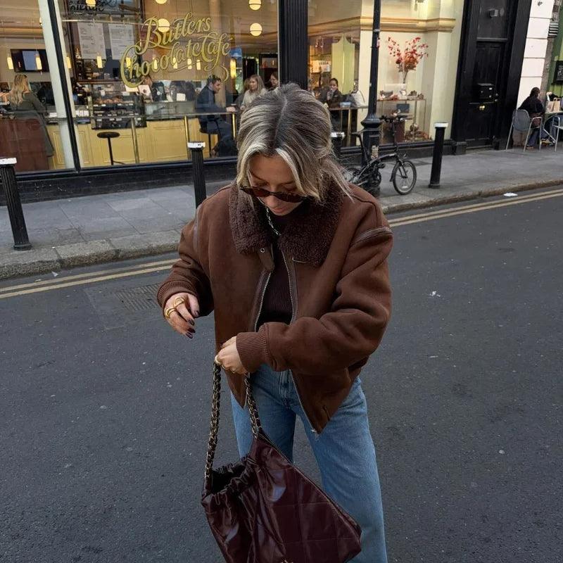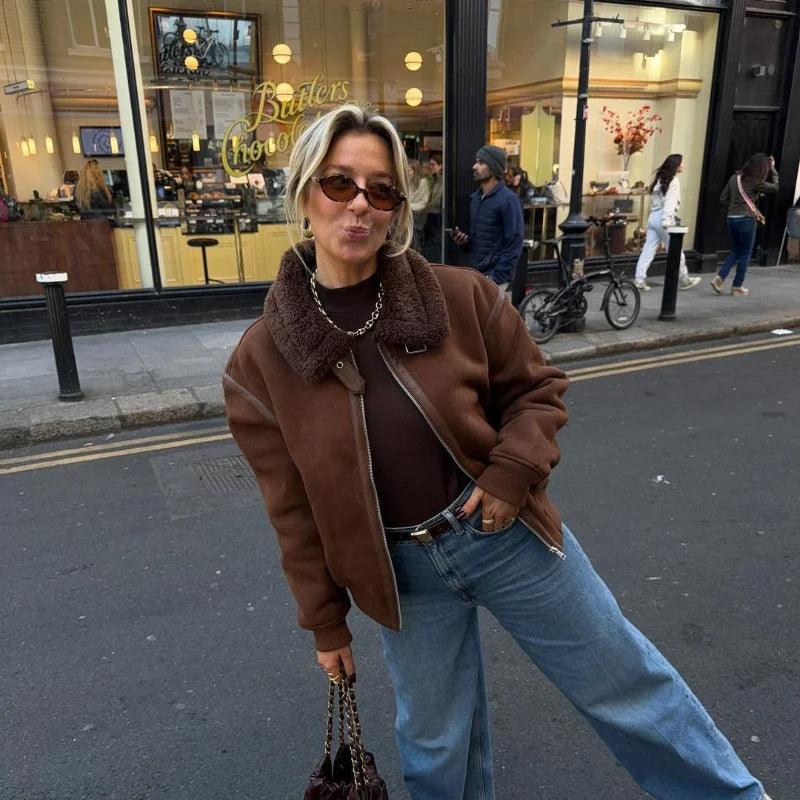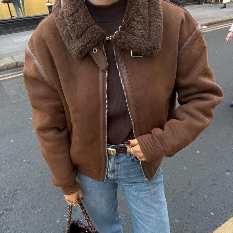 Vintage Kahve Kuzu Yünü Yaka Ceket