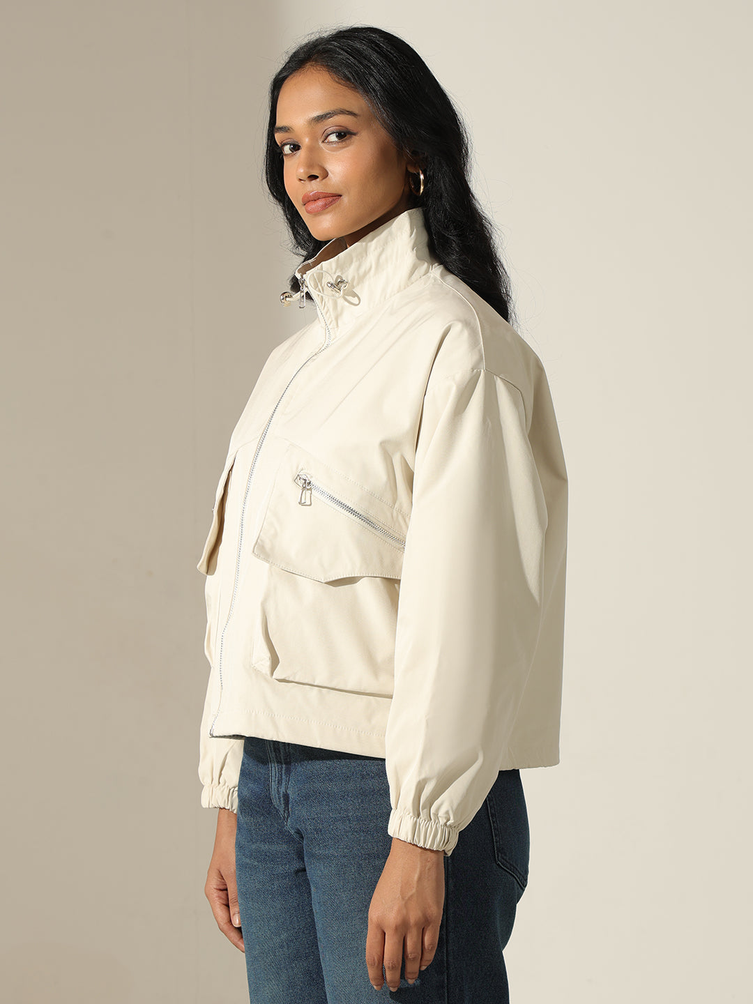 Kadınlar için tasarlanmış, krem rengi, fermuarlı ön kısmı ve kullanışlı cepleriyle şık ve çok yönlü bir dış giyim parçası olan bomber ceketi tanıtıyoruz. Bu ceket, klasik bomber ceket silüetini pratik saklama alanları ve yumuşak krem rengi dokusuyla birleştiriyor.